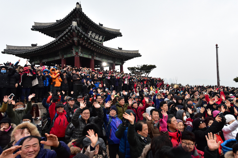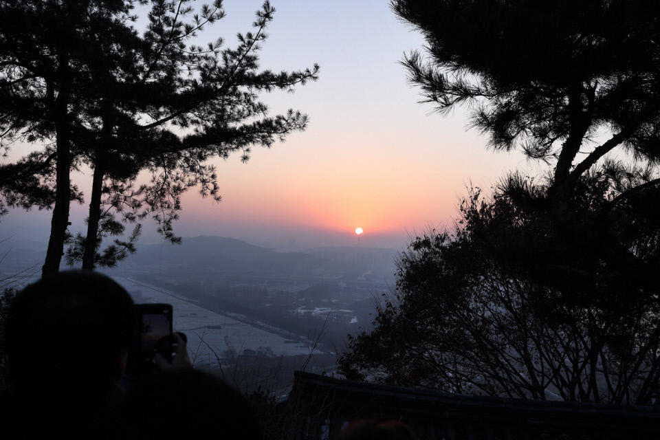 5. 남한산성 수어장대에 모인 시민들이 새해의 태양이 뜨기를 기다리고 있습니다.