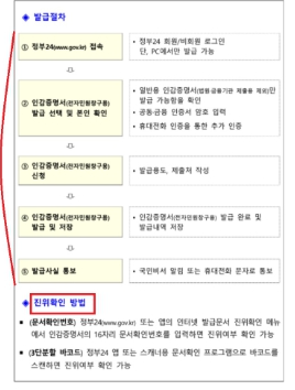 인감증명서 진위 여부는 정부24 또는 앱의 발급 문서 진위확인 메뉴에서 문서번호를 입력하거나 하단의 3단 분할 바코드를 통해 확인할 수 있습니다.