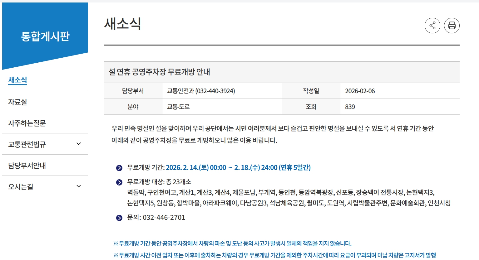 ✅ 부평구 공영주차장(무료: 2/15~2/18)