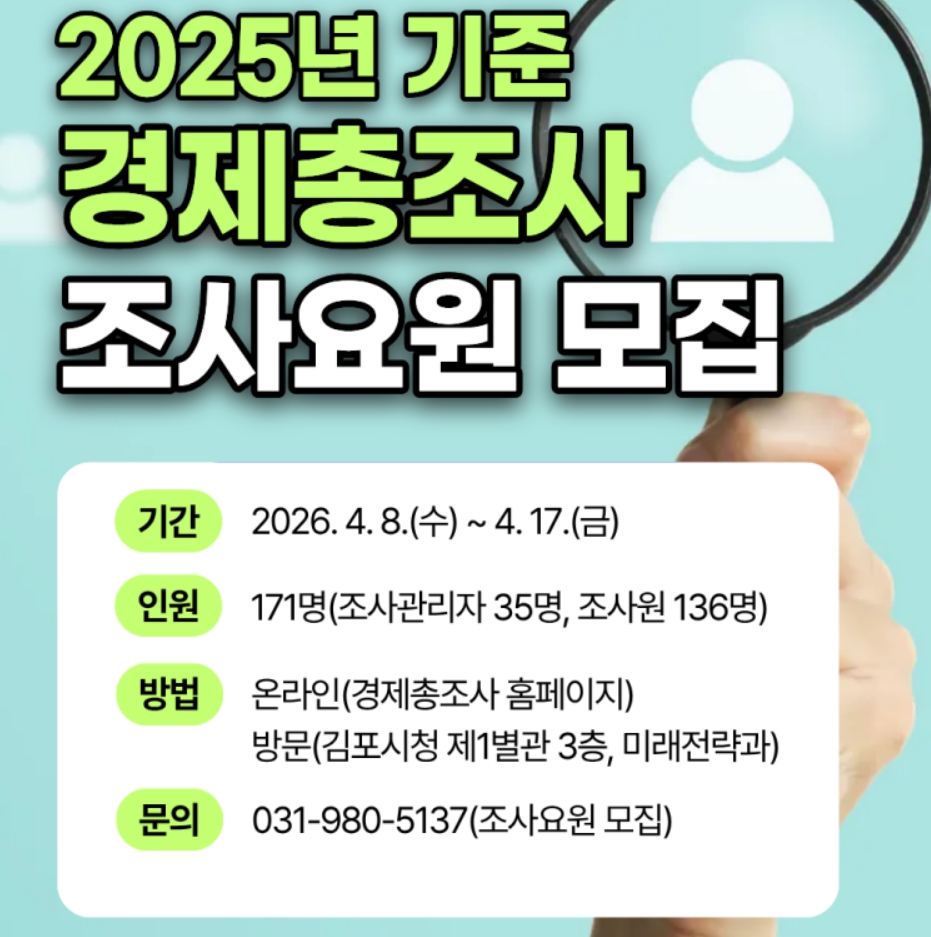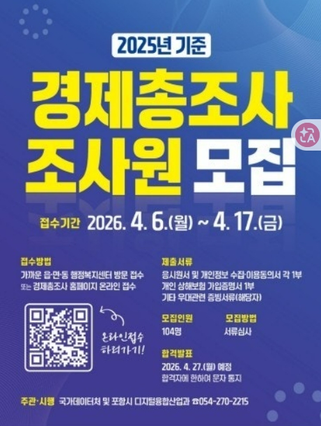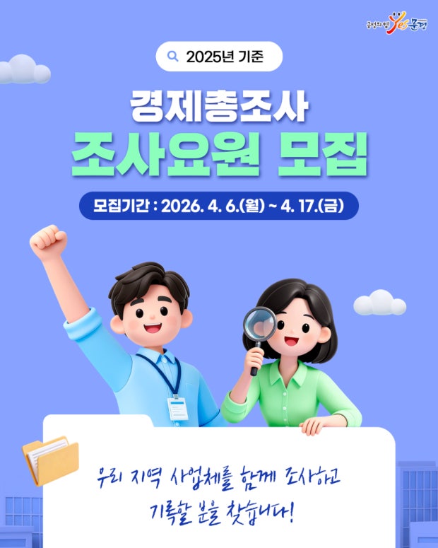 2026년에 실시되는 ‘2025년 기준 경제총조사’는 전국 모든 사업체를 대상으로 산업 구조와 분포를 파악하는 5년 주기 대규모 조사입니다. 이를 수행할 조사요원을 전국 지방자치단체를 통해 4월 17일까지 약 1만 6천여 명 규모로 모집하는 것이 공식 안내의 핵심입니다(지자체별로 모집 마감일·인원은 달라질 수 있음).