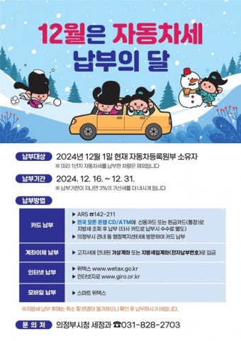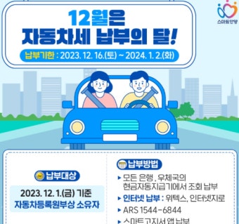 자동차세는 원래 1년에 2번(6월, 12월) 납부하지만, 1월에 1년치 세금을 미리 내면 할인을 받을 수 있는 제도입니다. 이를 ‘자동차세 연납’이라고 합니다.