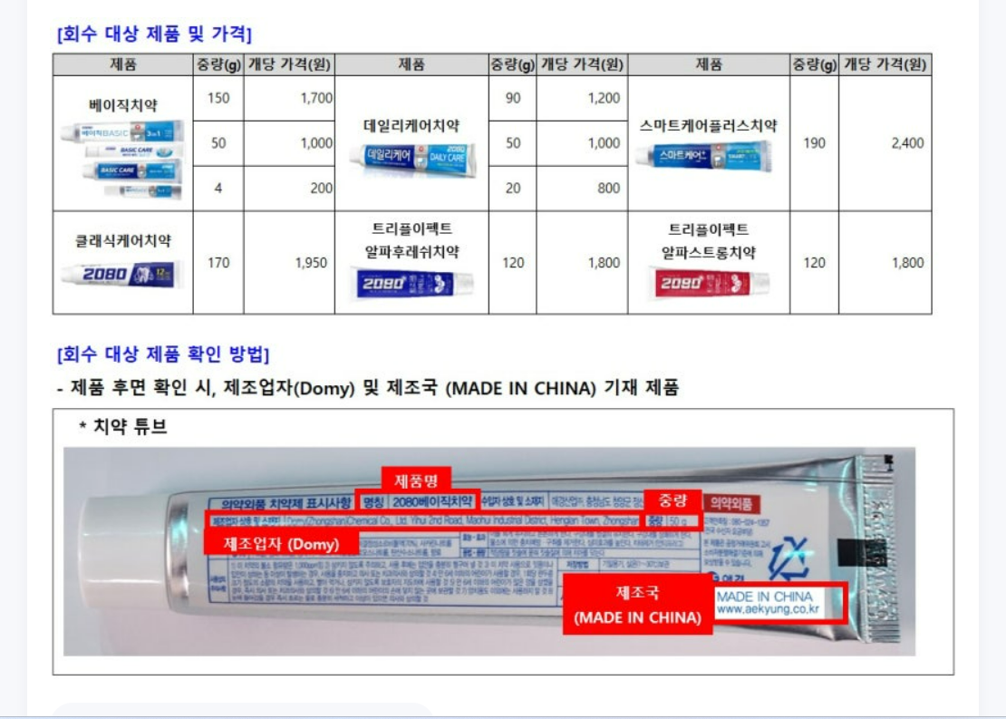 ✅ 📌 리콜 대상: 애경산업 2080 치약 중국산 6종